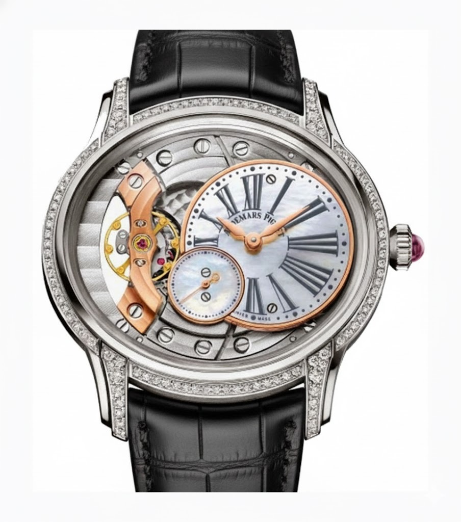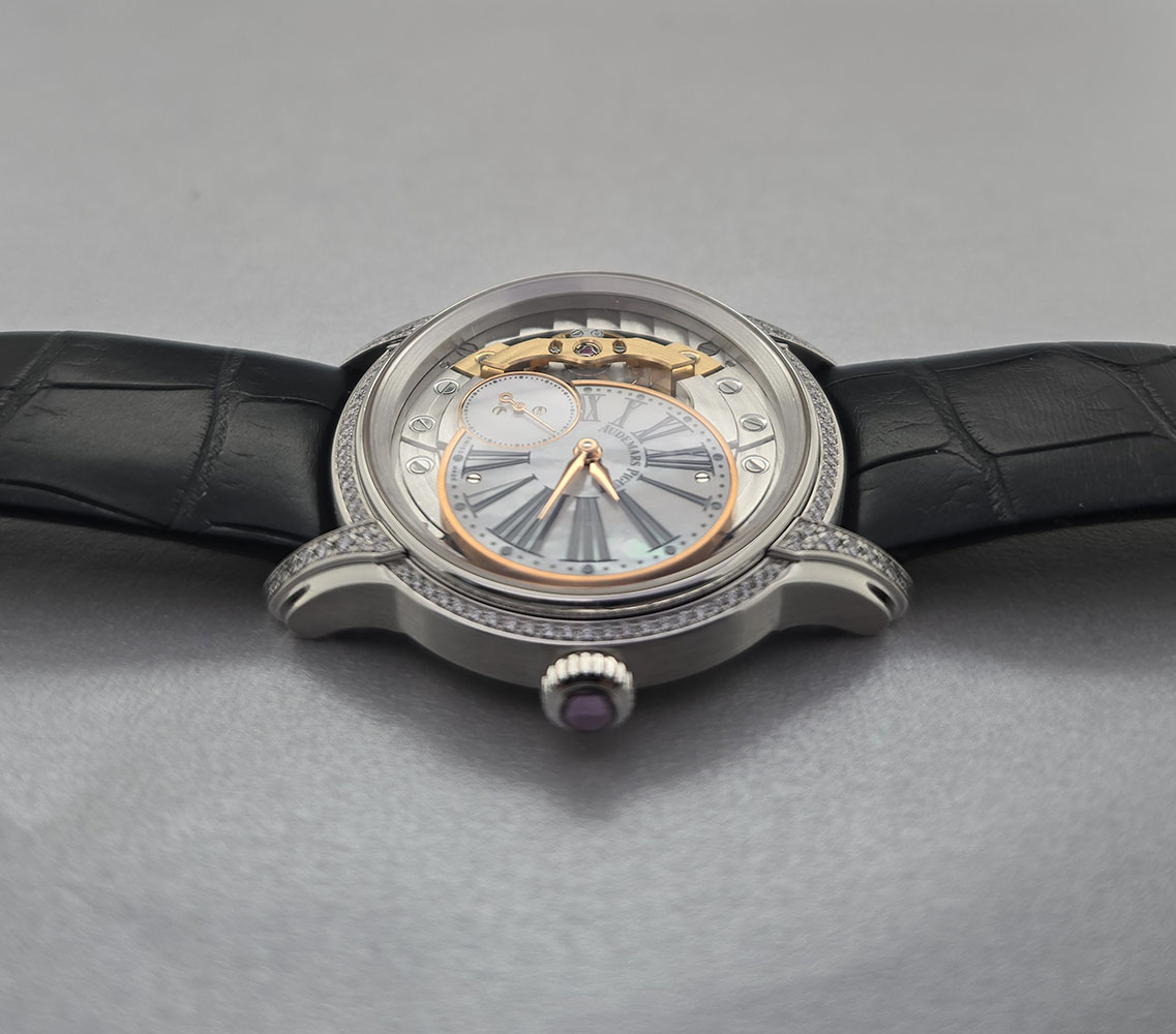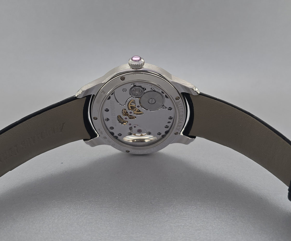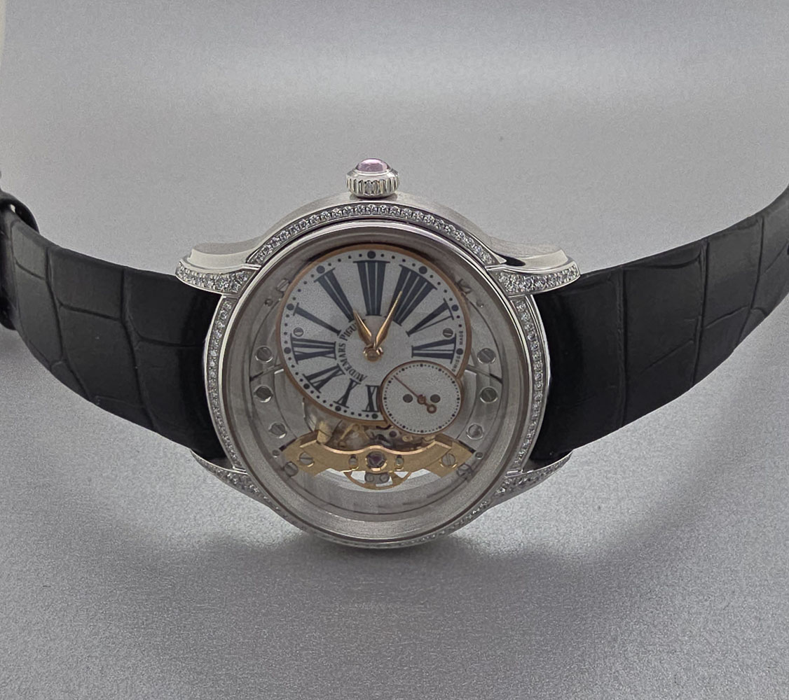 Introducing the Audemars Piguet Millenary 39.5mm (Reference: 77247OR), a stunning unisex luxury watch that exemplifies elegance and sophistication. Crafted from premium 18K white gold, this exquisite timepiece boasts an eye-catching skeleton face that showcases its intricate manual movement. With a case size of 39.5 mm and a full gray leather strap, it fits comfortably on any wrist while offering durability and style. The classic Roman numeral indices provide a touch of traditional elegance against the modern design of the skeleton dial. The fixed bezel is also made of luxurious 18K white gold, enhancing its overall prestige while ensuring water resistance for everyday wear. This timepiece comes complete with original papers but does not include a box. Retailing at $30,600.00, the Audemars Piguet Millenary is not just a watch; it's an investment in artistry and timeless style that will elevate any collection or outfit. Embrace the allure of haute horology with this exceptional piece today!