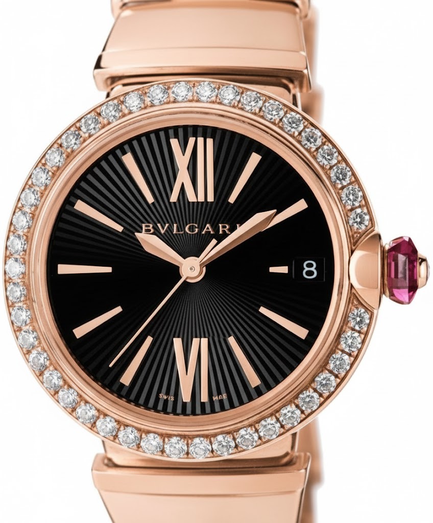 Elevate your style with the Bulgari Lvcea 33mm women's luxury watch (Reference: 102260), a masterpiece that embodies elegance and sophistication. Crafted by the renowned brand Bulgari/Bvlgari, this stunning timepiece features a captivating black face highlighted by Roman numeral indices that merge classic charm with contemporary design. The case size of this exquisite timepiece measures a perfect 33 mm, making it an ideal accessory for any wrist. It boasts an opulent strap made of premium 18K rose gold that complements its luxurious aesthetic. The double fold clasp ensures a secure fit while adding to the overall allure of this magnificent piece. Adding to its elegance is the diamond-encrusted bezel crafted from matching 18K rose gold. This sparkling detail not only enhances its beauty but also signifies its status as a high-end luxury item. With water resistance up to 50 meters and an automatic movement design, this Bulgari Lvcea watch is both functional and fashionable. Please note that this luxurious timepiece does not come with original box or papers but remains a coveted addition to any jewelry collection. Indulge in the ultimate blend of style and functionality with this exceptional Bulgari women’s watch—perfect for those who appreciate fine craftsmanship and timeless design.