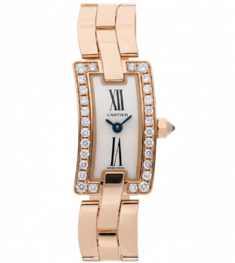 : Elevate your accessory collection with the stunning **Cartier Ballerine** women's watch (Model: **WG40023J**). This luxurious timepiece features a sleek case size of **14 x 23 mm**, beautifully crafted from **18K rose gold** that exudes sophistication and style. The elegant silver face adorned with classic Roman numerals adds a touch of timeless charm to your wrist. Designed for women who appreciate both form and function, this exquisite Cartier Ballerine is powered by a reliable **quartz movement**, ensuring precise timekeeping. The fixed bezel showcases the impeccable craftsmanship of Cartier while complementing the overall design of this stunning piece. With its full band made from premium **18K rose gold**, this watch not only looks fantastic but also offers durability and comfort for everyday wear. The fold-over push button clasp provides added security while allowing for easy adjustments to fit various wrist sizes. Although it does not come with original papers or box, this beautiful Cartier Ballerine is water-resistant and ready to accompany you through life's moments—both casual and formal. Whether you're dressing up for an event or adding a touch of luxury to your everyday outfit, this **Cartier women's timepiece** is the perfect choice for those who seek elegance in every detail. Indulge in luxury; choose the *Cartier Ballerine* as your next statement piece!