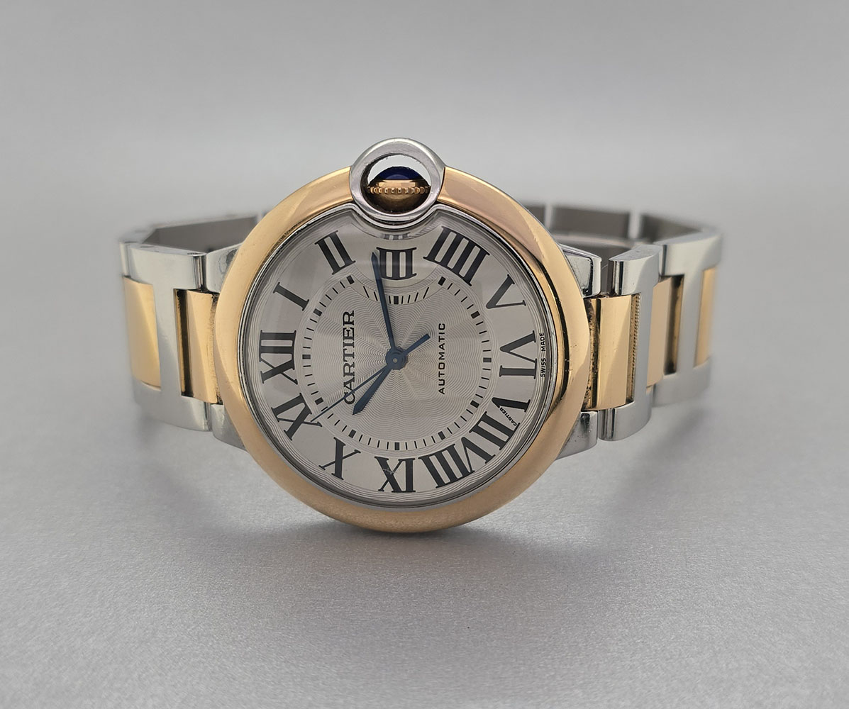 : Introducing the exquisite **Cartier Ballon Bleu 36mm** W2BB0003 unisex watch—a perfect blend of luxury and sophistication. Crafted by the renowned brand **Cartier**, this timepiece showcases a stunning case size of **36 mm** made from premium **18K rose gold** combined with resilient **stainless steel**. The elegant silver face features classic **Roman numeral indices**, adding a touch of timelessness to its design. With an **automatic movement**, this watch not only enhances your look but also ensures precision in keeping time. For added convenience and comfort, the wrist size fits most with its full band crafted from both **18K rose gold** and stainless steel. The double fold clasp type guarantees security while wearing it throughout your day. Designed for style as well as practicality, the Cartier Ballon Bleu is water-resistant up to **30 meters (100 feet)**—ideal for everyday wear without compromising on elegance. Although it does not come with a box, it includes papers verifying its authenticity. Originally produced in **2018**, this luxury timepiece is designed for anyone who appreciates high-quality craftsmanship. Elevate your accessory collection with this stunning unisex watch that embodies sophistication and charm!