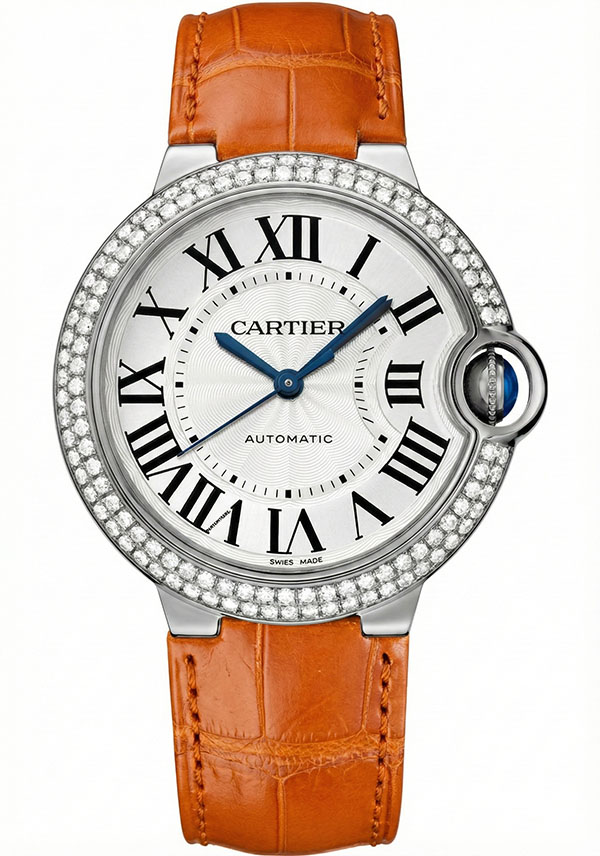 Introducing the **Cartier Ballon Bleu 36mm Women's Watch** (Reference: **WE900651**), a masterpiece of luxury and elegance that exemplifies Cartier's commitment to excellence. This stunning timepiece is crafted from **18K white gold**, making it not only a stylish accessory but also a symbol of sophistication. The **36 mm case size** perfectly balances presence and wearability, while the exquisite **silver face** adorned with classic **Roman numeral indices** ensures readability without compromising on style. The bezel is embellished with sparkling diamonds that add an extra touch of glamour to this remarkable piece. Designed specifically for women who appreciate fine craftsmanship and luxury, this automatic movement watch features a durable **leather strap** in an eye-catching orange color that contrasts beautifully against the sleek case. The deployment buckle clasp ensures comfort and security on your wrist. With a water resistance rating of **30 meters / 100 feet**, this Cartier timepiece can withstand everyday splashes while maintaining its pristine condition. However, please note that it does not come with box or papers. Retailing at a value of **$38,100**, the Cartier Ballon Bleu is more than just a watch; it's an investment in timeless elegance and prestige. Perfect for both casual outings and formal events, this luxury women's watch will elevate any outfit and serve as a cherished addition to your collection. Indulge yourself in the world of high-end horology with the Cartier Ballon Bleu - where craftsmanship meets luxury!