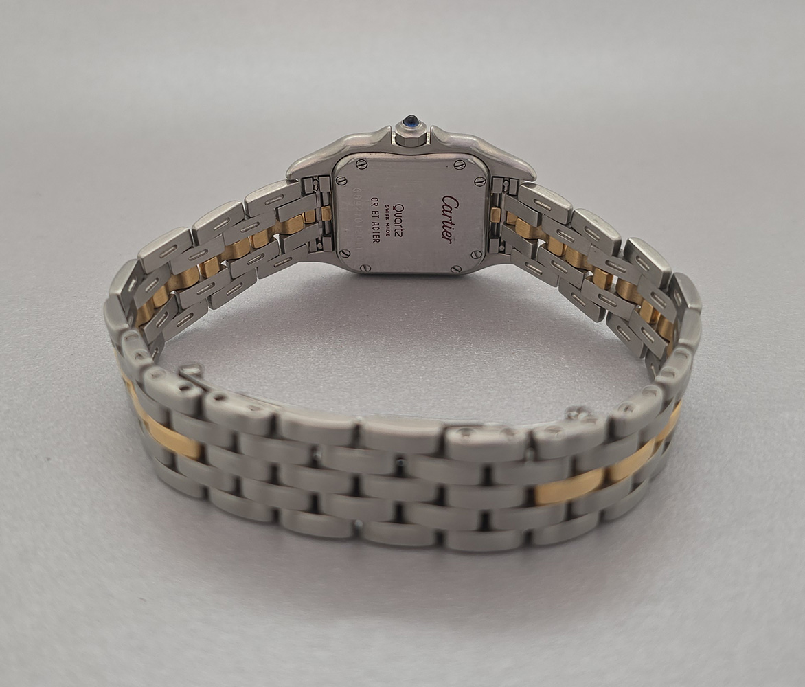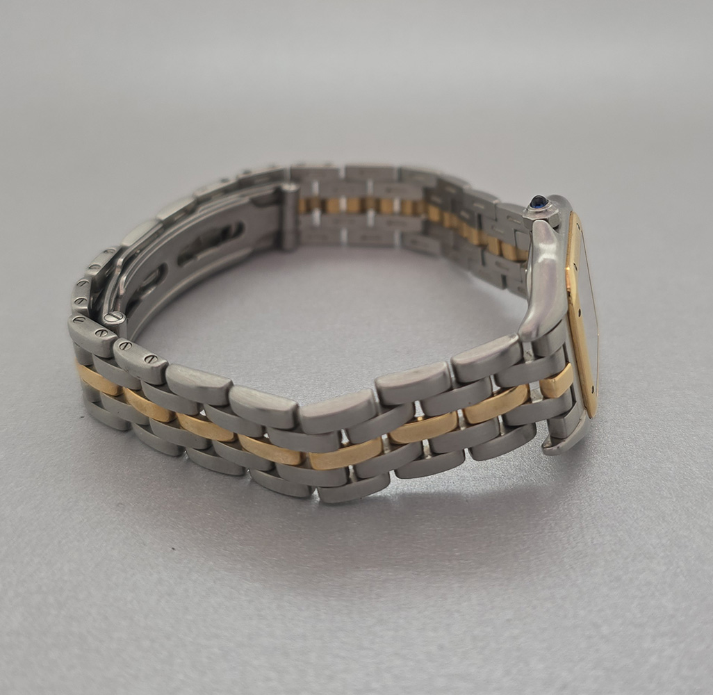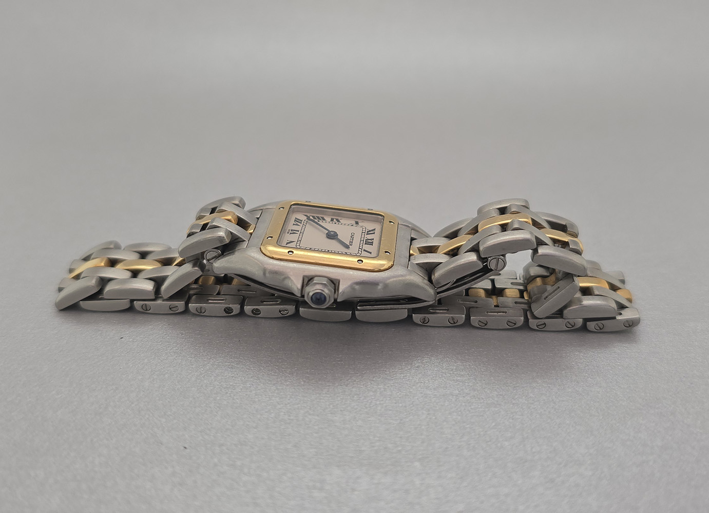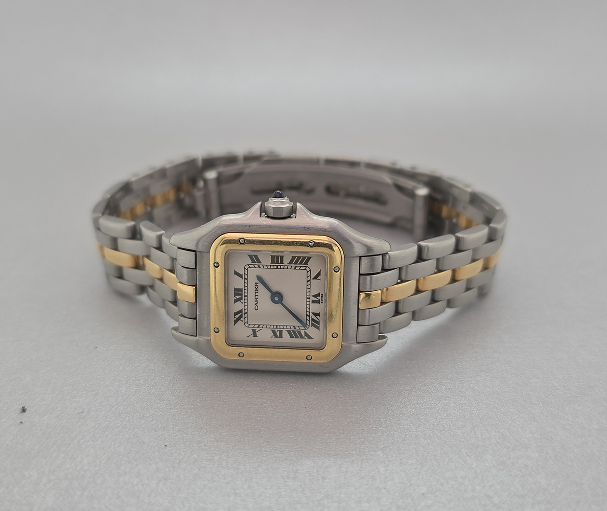 Elevate your accessory collection with the stunning **Cartier Panther Women's Watch**, model W25027B6. This exquisite timepiece features a unique square case size of **21 x 21 mm**, perfectly designed for the modern woman who appreciates luxury and style. Crafted from **18K yellow gold** and **stainless steel**, this watch embodies sophistication while providing durability. The elegant white face is beautifully complemented by classic Roman numeral indices that add an air of timelessness to its design. With a reliable **quartz movement**, you'll experience precision timing alongside aesthetic beauty. The fixed bezel crafted from 18K yellow gold enhances its luxurious appeal. Designed for comfort as well as style, this watch comes with a full band made from matching **yellow gold** and **silver stainless steel** and is equipped with a fold clasp hidden for easy wear. Although it does not include original box or papers, this piece stands as an iconic representation of the Cartier brand's dedication to craftsmanship. Not only is this timepiece water-resistant, making it practical for everyday use, but it also serves as an ideal gift for any special occasion or simply to treat yourself to something extraordinary. Whether you're dressing up for an event or adding flair to your casual attire, the Cartier Panther Women’s Watch is your perfect companion. Invest in this luxurious piece today!