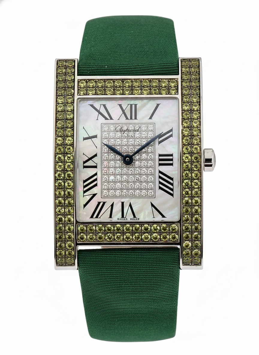 Introducing the exquisite **Chopard H Series Women's Watch**, a true masterpiece that blends luxury and sophistication in every detail. Crafted with an elegant **28 x 40 mm** case made from **18K white gold**, this timepiece is designed to make a statement on any wrist. The reference number **17/3251-56** highlights its unique identity within the prestigious Chopard collection. The face of this stunning watch features a captivating **mother of pearl** finish that adds depth and charm to its overall aesthetic. Complemented by classic **Roman numerals**, it exudes timeless elegance that appeals to discerning tastes. Designed with practicality in mind, this women's watch boasts a reliable **quartz movement** for precise timekeeping. Its durable yet stylish leather strap not only ensures comfort but also enhances the luxurious feel of the piece. The full band comes in an attractive green color that beautifully contrasts with the radiant white gold case. While this gorgeous timepiece does not come with original box or papers, it remains an exceptional addition to any jewelry collection. It features a fixed bezel made from matching **18K white gold** and is water-resistant for added versatility in everyday wear. Whether you’re dressing up for a special occasion or looking for an elegant accessory for daily use, the Chopard H Series Women’s Watch is your perfect companion—a sublime fusion of style and function that embodies luxury at its best. Don’t miss out on owning this exquisite blend of artistry and precision!