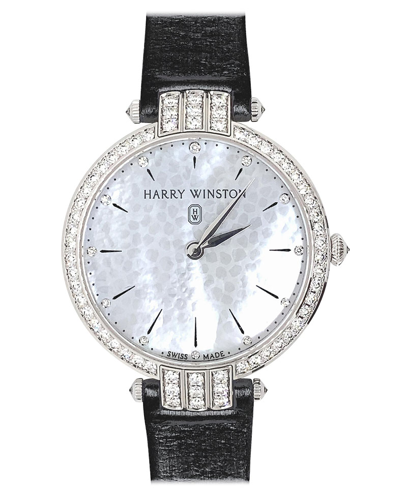 Introducing the **Harry Winston Premier 36mm Watch (Model: 210/LQ36W)**—an exquisite embodiment of luxury and elegance tailored for both men and women. This unisex timepiece features a striking **mother of pearl face**, adorned with **non-numeric hour marks** that enhance its sophisticated appeal. Crafted from **18K white gold**, the case not only boasts durability but also an opulent shine that complements the diamond-studded bezel beautifully. Each diamond is meticulously set to ensure brilliance from every angle. The elegant **leather strap** offers comfort while maintaining a timeless style suitable for any occasion. With a case size of **36 mm**, this Harry Winston watch sits perfectly on the wrist—a true statement piece for those who appreciate high-end craftsmanship. Powered by reliable **quartz movement**, you can trust in its precision as much as you admire its beauty. Included with your purchase are the original box and papers, ensuring authenticity and value retention. The retail value of this exceptional luxury timepiece is **$31,300.00**, making it not just a purchase but an investment in sophistication. Enhance your collection with this remarkable Harry Winston Premier watch—where artistry meets functionality in one stunning package.