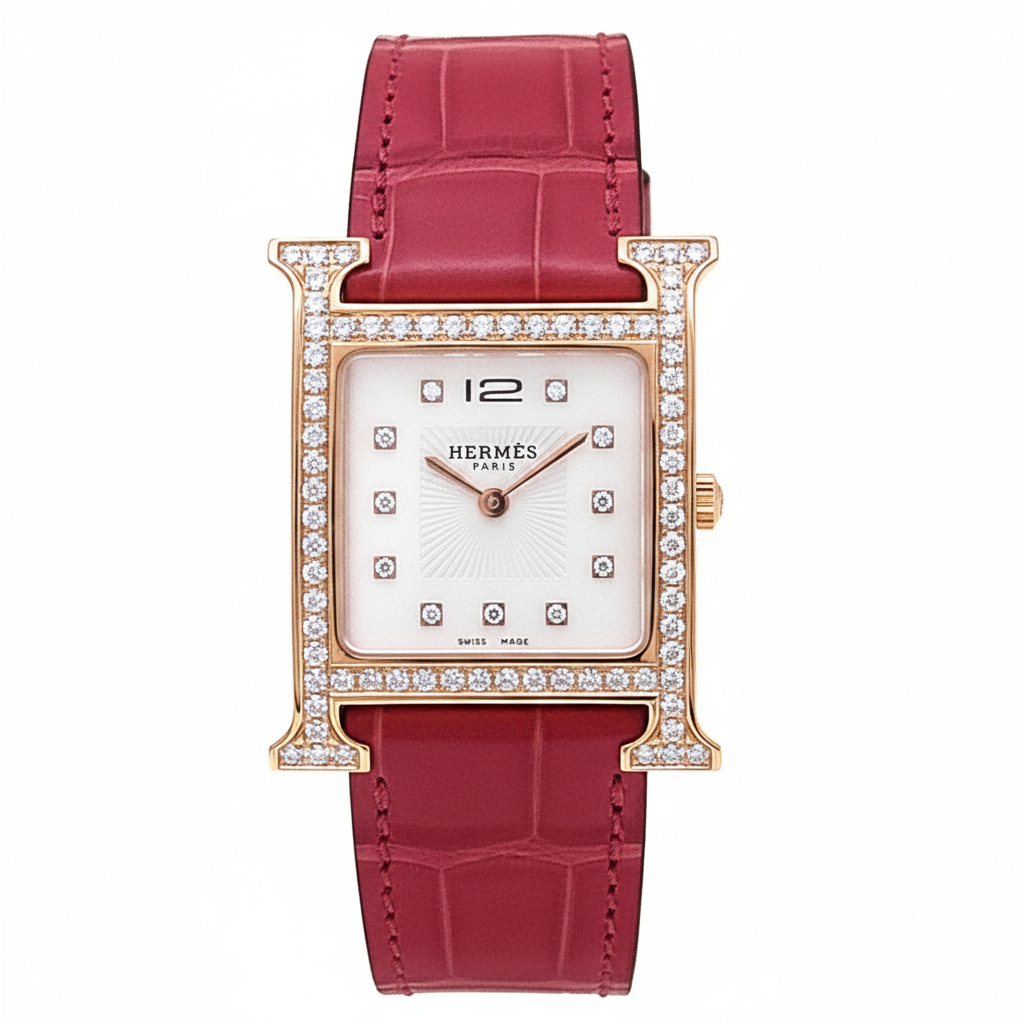 Introducing the exquisite **Hermes Heure H** women’s watch – a perfect blend of elegance and sophistication. Crafted with meticulous attention to detail, this timepiece features a unique **case size of 30 x 35 mm**, making it an ideal accessory for any wrist. The luxurious **18K rose gold** case and bezel exude opulence while providing durability and style. The enchanting **mother of pearl face** adds an ethereal quality to the timepiece, complemented by stylish **Arabic numerals** that ensure easy readability. Powered by a reliable **automatic movement**, this watch promises accuracy and longevity. Designed with comfort in mind, the full band is made from premium pink leather that not only enhances its aesthetic appeal but also ensures a comfortable fit on your wrist. Although it does not come with box or papers, its authenticity remains unquestionable as you wear this stunning piece. With water resistance capabilities and a secure tang clasp type to keep it securely fastened on your wrist, the Hermes Heure H is as practical as it is beautiful. Whether dressing up for an elegant evening or adding flair to your everyday outfit, this luxury women’s watch from Hermes is the ultimate statement piece that reflects your exceptional taste. Elevate your collection today with the **Hermes Heure H 30x35mm (HH1.571e)** – where timeless design meets modern functionality!