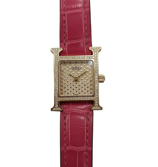 Introducing the stunning **Hermes Heure H Women's Watch**, a sophisticated accessory that embodies elegance and luxury. Crafted by the renowned brand **Hermes**, this exquisite timepiece features a compact **17.2 mm** case made from **18K rose gold**, radiating warmth and sophistication. The model number **W054799WW00** highlights its exclusive design tailored specifically for women who appreciate fine craftsmanship. The face of the watch features a delicate **rose color** that beautifully complements the overall aesthetic. Designed with comfort and style in mind, this watch comes with a chic **pink leather strap**, ensuring it fits seamlessly into your wardrobe while providing all-day comfort on your wrist. The absence of hour marks adds to its minimalist charm while maintaining functionality. Equipped with reliable **quartz movement**, this timepiece promises accuracy and durability. The fixed bezel also crafted from **18K rose gold** enhances its luxurious appeal while ensuring water resistance for those daily adventures. Please note that this beautiful piece does not come with original box or papers but stands as an emblem of timeless elegance. Elevate your accessory game with the Hermes Heure H Women’s Watch—an ideal choice for anyone seeking an elegant yet practical luxury timepiece.