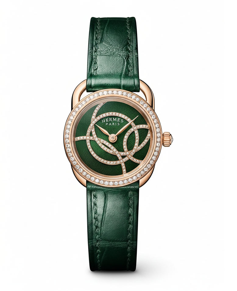 Elevate your timepiece collection with the stunning **Hermes Nantucket 29mm Women's Watch** (Reference: **W059677WW00**). This luxurious watch combines impeccable craftsmanship with sophisticated design elements that make it a must-have accessory for any stylish woman. Crafted from **18K rose gold**, this exquisite timepiece features a sleek **29 mm case size** that fits comfortably on the wrist. The striking **green face color** is complemented by elegant non-numeric hour marks, ensuring you can tell time effortlessly while maintaining a chic aesthetic. The **leather strap** not only adds to the overall luxury feel but also provides durability and comfort for everyday wear. With its tang clasp type, this women's watch ensures a secure fit on your wrist. Designed for versatility, this Hermes Nantucket model is water-resistant and powered by precise quartz movement. Although it comes without original box or papers, its beauty and functionality speak volumes about quality craftsmanship. Perfectly suited for both casual outings and formal events, the Hermes Nantucket 29mm Women's Watch is more than just a timekeeper; it's an expression of elegance. Indulge yourself in timeless style today!
