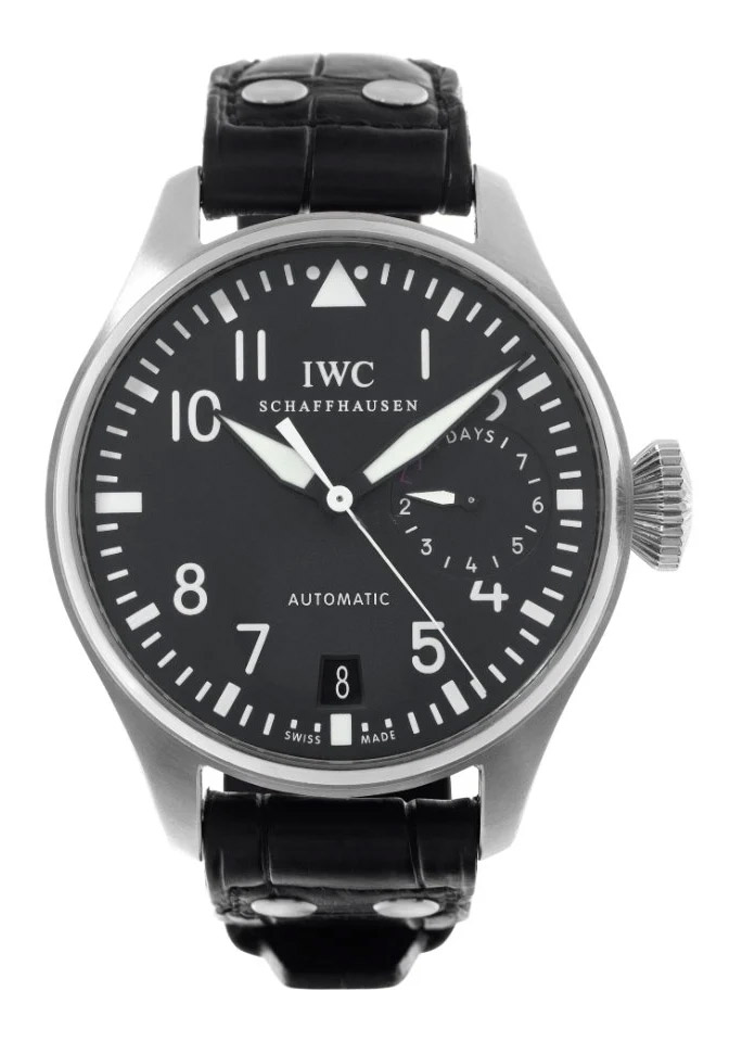 Elevate your wrist game with the IWC Big Pilot 46mm IW500401 Stainless Steel Men's Watch. This exceptional timepiece combines sophisticated design with robust functionality. Crafted from high-quality stainless steel, the case measures an impressive 46 mm and is complemented by a sleek black face adorned with clear Arabic numerals for optimal readability. The IWC Big Pilot is not just about looks; it houses an automatic movement that ensures precision and reliability in every tick. Designed for the modern man who values both style and substance, this watch features a durable leather strap that provides comfort and elegance on any occasion. The deployment buckle adds an extra layer of convenience while ensuring a secure fit on your wrist. With its fixed stainless steel bezel and reliable water resistance capabilities, this timepiece is perfect for everyday wear or special occasions alike. Please note that this model does not come with original box or papers. Whether you're adding to your collection or searching for the perfect gift, the IWC Big Pilot 46mm IW500401 is sure to impress with its timeless appeal and standout features. Experience luxury on your wrist today!