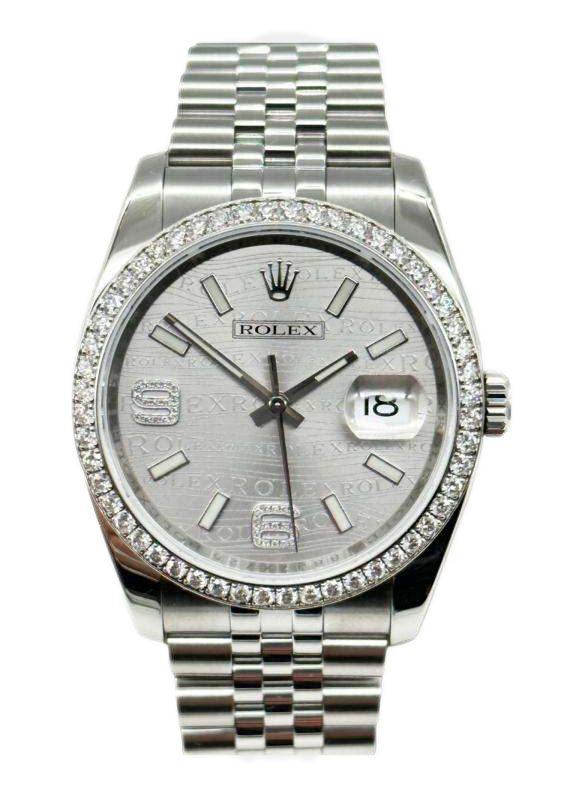 : Introducing the timeless elegance of the **Rolex DateJust 36mm (Reference: 116244)**—a luxurious unisex watch that seamlessly combines style and functionality. Crafted from high-quality **stainless steel**, this exquisite timepiece is designed to elevate any outfit. With a **case size of 36 mm**, it fits comfortably on both men's and women's wrists. The face showcases a striking **silver Arabic diamond** layout that adds a touch of sophistication to your wrist. The **automatic movement** ensures precision timing while the **water resistance** rating of up to **100 meters (330 feet)** makes it perfect for various activities. This model features a stunning bezel made from solid **18K white gold**, adorned with sparkling diamonds that enhance its luxurious appeal. The classic **Jubilee strap/band** provides not only comfort but also a refined aesthetic that complements its overall design. Although this piece does not come with original box or papers, its retail value stands at an impressive **$16,750**, making it an investment in elegance and prestige. Whether you are dressing up for an occasion or looking for an everyday luxury accessory, the Rolex DateJust is the perfect choice. Discover true craftsmanship and style with this iconic timepiece—an essential addition to every discerning collector's wardrobe!