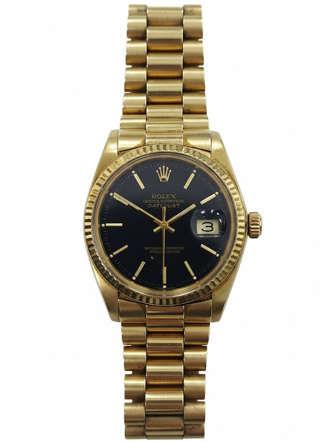 Introducing the iconic **Rolex Datejust 36mm** (Reference: **1601**) – a timeless masterpiece crafted for the discerning gentleman. This luxurious **18K Yellow Gold men's watch** showcases a striking **silver stick dial**, seamlessly combining elegance with functionality. With a case size of **36 mm**, this exquisite timepiece is fitted with an **automatic movement** that ensures precise timekeeping. The **fluted bezel**, made from solid **18K Yellow Gold**, adds a touch of sophistication to its overall design. Not only does it boast style, but it also offers durability with a water resistance of up to **100 meters**. The non-numeric hour marks adorn the elegant face beautifully while the full band crafted in matching **18K Yellow Gold** ensures comfort on your wrist. The classic tang clasp secures this remarkable piece firmly in place. Ideal for any occasion or as an addition to your luxury collection, the Rolex Datejust is more than just a watch; it's a statement of style and success. Please note that this model does not come with original box or papers. Elevate your timepiece game with the unparalleled craftsmanship of this Rolex masterpiece!