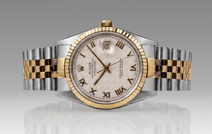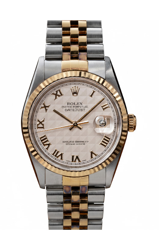 Discover the timeless elegance of the **Rolex Datejust 36mm 16233**, a distinguished men's watch that embodies luxury and sophistication. Crafted with precision by **Rolex**, this exceptional timepiece features a lustrous case made from **18K yellow gold** and **stainless steel**, offering both durability and style. With a **case size of 36 mm** and an elegant **ivory Roman dial**, this watch is designed to make a statement. The intricate **Roman numeral indices** enhance its classic appeal while ensuring easy readability. It comes equipped with a robust **automatic movement**, ensuring reliable performance for years to come. The iconic **fluted bezel** adds to its luxurious aesthetic while the unique **Jubilee band** provides comfort on your wrist. Designed for versatility, this watch is perfect for both formal occasions and everyday wear. With a production year dating back to **1990**, this model holds historical value among collectors. Although it does not include original papers or box, its charm remains undiminished. Additionally, it offers impressive water resistance capabilities up to **100 meters / 330 feet**, making it a practical choice as well. Whether you're looking to elevate your personal collection or searching for the perfect gift for someone special, the Rolex Datejust 36mm 16233 is an impeccable choice that combines functionality with high-end luxury. Experience true craftsmanship with this remarkable timepiece today!