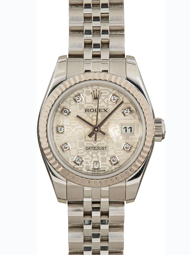 Elevate your wrist game with the exquisite **Rolex DateJust 26mm (Reference: 179174)** women's watch. Crafted by the renowned luxury brand **Rolex**, this stunning timepiece features a durable **stainless steel** case that measures **26 mm**, making it a perfect choice for women who appreciate elegance in a compact design. This particular model showcases an eye-catching **silver face** adorned with non-numeric hour marks that exude sophistication. The fixed bezel is beautifully made from **18K white gold**, adding an extra touch of opulence to your everyday look. With its classic **Jubilee strap**, this watch not only guarantees comfort but also ensures you remain stylish on any occasion. Built in **2008**, this vintage piece is part of the iconic DateJust collection known for its timeless appeal. The automatic movement ensures precision in timekeeping while providing effortless functionality. Additionally, it boasts impressive water resistance of up to **100 meters (330 feet)**—ideal for those who lead an active lifestyle. Whether you're dressing up for a formal event or adding flair to your casual outfit, this luxury women's watch is versatile enough for any setting. Please note that this model does not come with original box or papers but offers unparalleled quality and craftsmanship. With a retail value of approximately **$9,200**, investing in this remarkable Rolex DateJust means more than just owning a timepiece; it's about embracing a legacy of excellence and style that will last for generations. Don't miss out on the opportunity to own this iconic piece of horological history!