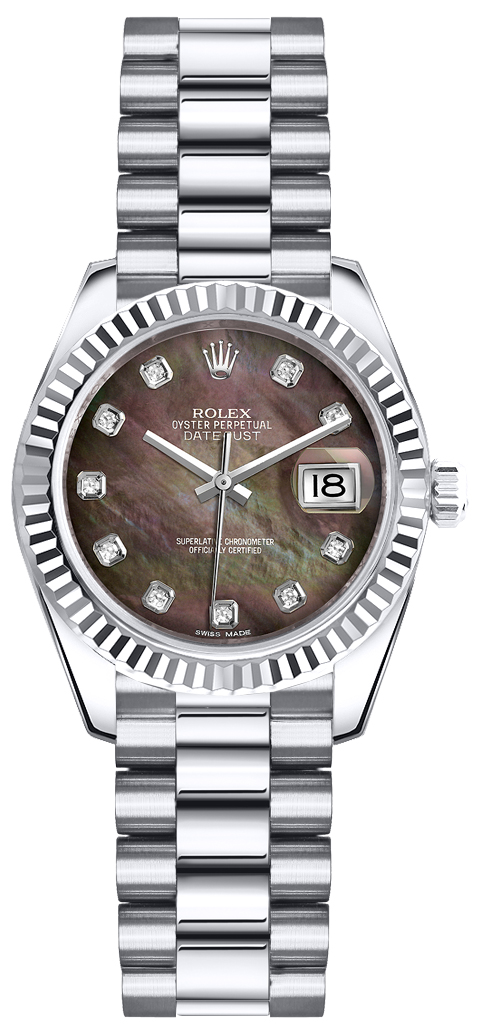 Introducing the stunning **Rolex Datejust 26mm (Reference: 179179)** – a quintessential luxury women's watch that embodies sophistication and style. Crafted with meticulous attention to detail by the renowned brand **Rolex**, this exquisite timepiece features a case size of **26 mm** made from **18K white gold**, offering both durability and elegance. The standout feature of this model is its captivating **black Tahitian mother of pearl face**, complemented by non-numeric hour marks that exude timeless beauty. The **fluted bezel**, also crafted from **18K white gold**, adds a touch of refinement to this already luxurious piece. Powered by an **automatic movement**, the Rolex Datejust ensures precision and reliability. Whether you're attending a formal event or enjoying a casual outing, its water resistance of up to **100 meters** makes it suitable for various occasions without compromising on style. This particular model was produced in **2005** and comes with a classic **President strap/band** that enhances comfort while maintaining a chic look. The deployment clasp further guarantees security on your wrist. Although it does not come with original box or papers, its retail value stands impressively at **$28,100.00**, making it not just a beautiful accessory but also a valuable addition to any collection. Elevate your wardrobe with the Rolex Datejust—an emblem of class and sophistication that every woman deserves to own!