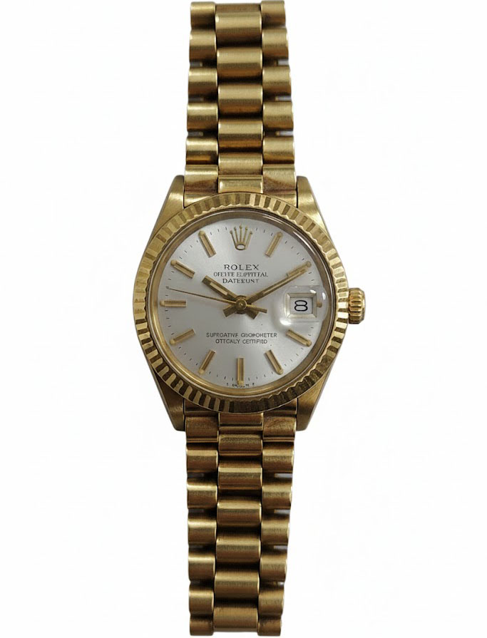 Introducing the exquisite **Rolex Datejust** 26mm women’s watch (Reference: **6517**), a timeless piece crafted for elegance and sophistication. Produced in **1972**, this luxury timepiece showcases a stunning **silver face** that beautifully contrasts with its **18K yellow gold case**. This classic wristwatch is designed with a **full band** made from the iconic **President strap**, known for its comfort and style. The **fixed bezel**, also made of **18K yellow gold**, enhances the overall allure of this remarkable piece. With non-numeric hour marks on its face and a fold-over push-button clasp type, this watch seamlessly combines functionality with luxury. The robust construction ensures water resistance while housing a precise manual movement that speaks to Rolex’s commitment to quality craftsmanship. Although it does not come with the original box, it does include essential papers for authenticity. Whether you're adding to your collection or searching for that perfect statement accessory, this vintage Rolex Datejust is an ideal choice for any woman looking to embody elegance and sophistication. Experience luxury like never before with this unparalleled timepiece!