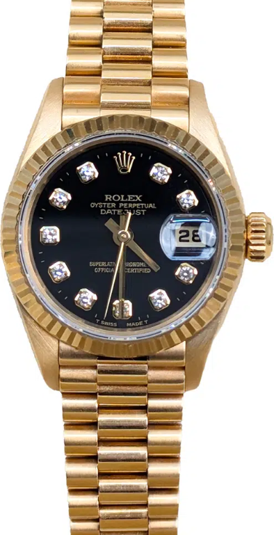 : Introducing the stunning **Rolex Datejust** (Model: 69178), an icon of luxury and sophistication specifically designed for women who appreciate fine craftsmanship. With a case size of **26 mm**, this exquisite timepiece is made entirely from **18K yellow gold**, offering both durability and a timeless aesthetic. The elegant **black face** is adorned with non-numeric hour marks that enhance its minimalist charm while ensuring easy readability. The watch features an automatic movement mechanism that guarantees precision with every tick. It’s perfect for both everyday wear and special occasions. Crafted for comfort and style, the **wrist size** accommodates a variety of wrist sizes thanks to its adjustable design. The strap/band is also made from high-quality **18K yellow gold**, complemented by a fold clasp hidden closure that adds to its sleek appearance. This luxurious Rolex Datejust not only stands out in terms of design but also offers water resistance — making it suitable for various activities without compromising on elegance. Although it does not come with original paperwork or box, its remarkable craftsmanship speaks volumes about its value. Elevate your collection with the timeless beauty of the **Rolex Datejust**—the perfect blend of style and functionality for any modern woman!