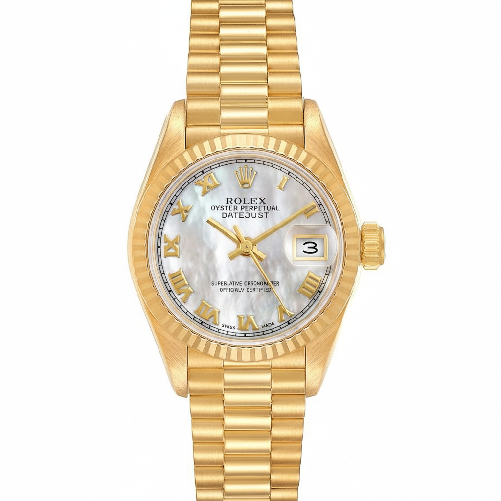 Elevate your style with the exquisite **Rolex Datejust 26** (Reference: **69178**), designed specifically for women who appreciate luxury and sophistication. This stunning timepiece features an elegant **26 mm case** crafted from **18K yellow gold**, making it both durable and a true statement piece. The face of the watch boasts a beautiful **mother of pearl dial**, enhanced by non-numeric hour marks that exude understated elegance. The fluted bezel is also made from **18K yellow gold**, adding to the watch's allure. With an automatic movement at its heart, this timepiece not only looks exceptional but also offers reliability and precision. This specific model was produced in **1991** and comes without original box or papers but retains its timeless appeal that transcends generations. The full band is expertly crafted from **18K yellow gold**, ensuring comfortable wear on any wrist size. Enjoy peace of mind with its water resistance feature; perfect for everyday use while maintaining the luxury aesthetic you desire. The fold clasp ensures a secure fit on your wrist. With a retail value of approximately **$13,000**, this **Rolex Datejust 26** is not just a watch; it's an investment in style and craftsmanship that will last a lifetime. Whether dressing up for formal events or adding flair to casual outfits, this women's watch is the perfect accessory for those who appreciate fine horology. Experience the allure of luxury with this remarkable Rolex piece — where timeless design meets impeccable functionality!