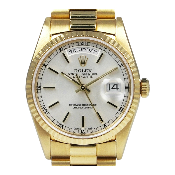 lex, Day-Date 36mm, 18238, 18K Yellow Gold, Watch, Silver Index, President Strap, Fluted Bezel, Automatic Movement Meta Title: Rolex Day-Date 36mm 18238 18K Yellow Gold Watch | Silver Index Meta Description: Shop the iconic Rolex Day-Date watch in 18K yellow gold with a silver index dial. This automatic timepiece features a president strap and fluted bezel. Product Description: Introducing the luxurious Rolex Day-Date 36mm watch in stunning 18K yellow gold. This classic timepiece from the year 1999 features a silver index dial that exudes elegance and sophistication. The president strap adds a touch of refinement to this exquisite watch, while the fluted bezel showcases intricate craftsmanship. With water resistance up to 100 meters/330 feet, this automatic movement watch is perfect for everyday wear. Add this timeless piece to your collection today. (Please note that box and papers are not included.)