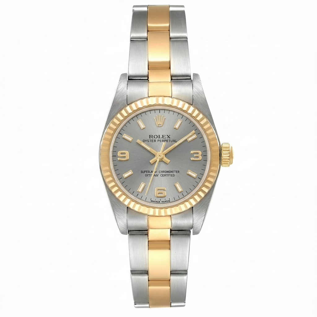 Introducing the exquisite **Rolex Oyster Perpetual** 24mm women’s watch (Reference: **76193**), a timeless piece that embodies luxury and sophistication. Crafted in **18K yellow gold** and durable **stainless steel**, this stunning timepiece showcases an elegant **silver face** adorned with Arabic numerals for easy readability. With a compact case size of **24 mm**, this women’s watch is perfect for those who appreciate smaller yet impactful designs. The fixed bezel adds to its sleek profile while enhancing its overall aesthetic appeal. This model features a comfortable **Oyster strap/band** that complements its chic look and includes a reliable fold-over push-button clasp for added security. Manufactured in **2001**, this Rolex model is not just a statement accessory but also a symbol of enduring quality. It offers water resistance and operates on a dependable manual movement mechanism—ideal for those who value precision in their timepieces. Please note that this luxurious wristwatch does not come with original box or papers. Elevate your style with the distinguished craftsmanship of the Rolex Oyster Perpetual; an investment that transcends trends and celebrates individuality. Whether it's for everyday wear or special occasions, this women's watch is sure to impress.