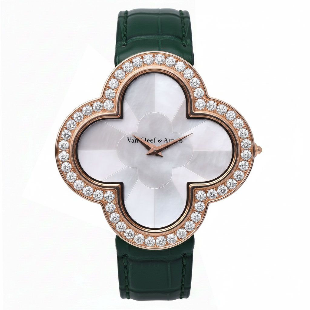 : Introducing the Van Cleef & Arpels Alhambra Talisman 40mm Women's Watch (Reference: 257274), an embodiment of elegance and sophistication. Crafted in luxurious **18K rose gold**, this exquisite timepiece features a stunning **white mother of pearl** face that beautifully contrasts with its rich case material. With a **case size** of **40 mm**, it makes a bold statement on any wrist. This elegant watch is designed for the discerning woman who appreciates both style and functionality. The **quartz movement** ensures precise timekeeping while the **fixed bezel** adds to its refined aesthetic. The absence of hour marks offers a minimalist look that enhances the overall charm of the piece. The Alhambra Talisman comes with a comfortable leather strap that fits most wrist sizes and is secured by a reliable tang clasp. While it boasts water resistance up to **30 meters / 100 feet**, making it suitable for everyday wear, it's best kept safe during swimming or diving activities. Although this model does not come with its original box, it includes essential papers for authenticity verification. This is not just a watch; it's a statement accessory that reflects your taste for luxury and quality craftsmanship. Elevate your collection or gift someone special with this remarkable Van Cleef & Arpels Alhambra Talisman—where elegance meets artistry in every tick!