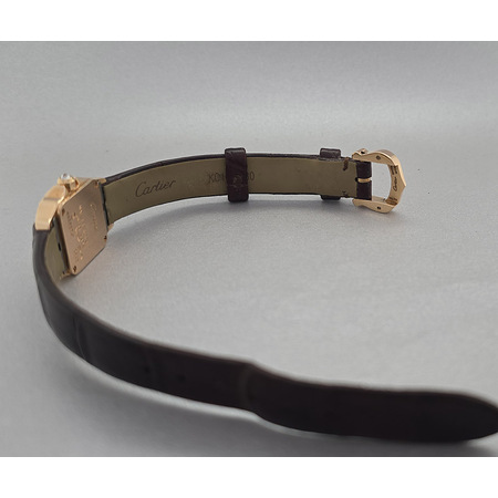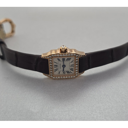 : Elevate your timepiece collection with the exquisite **Cartier Santos Demoiselle**. This elegant **women's watch**, reference number **WF902004**, boasts an eye-catching case size of **24mm x 19mm**, making it perfect for those who appreciate both style and functionality. Crafted from luxurious **18K rose gold**, this timepiece is adorned with a captivating diamond bezel that enhances its sophisticated charm. The striking **silver face** is complemented by classic Roman numeral indices, adding a timeless touch to its modern design. The **quartz movement** ensures precision in every tick while offering reliable performance day after day. With a water resistance of up to **30 meters**, this luxurious accessory can withstand everyday splashes without sacrificing its elegance. Designed for the discerning woman who values both fashion and function, this Cartier Santos Demoiselle features a comfortable leather strap and a secure tang clasp for ease of wear. Transform your wrist into a canvas of sophistication with the Cartier Santos Demoiselle—a true testament to luxury and style that speaks volumes about your refined taste in jewelry.