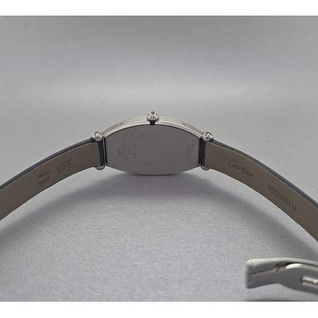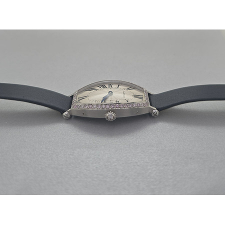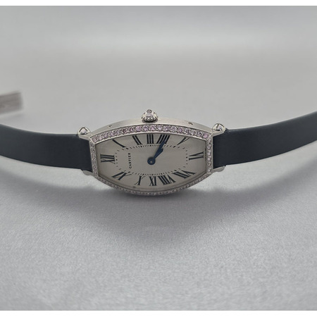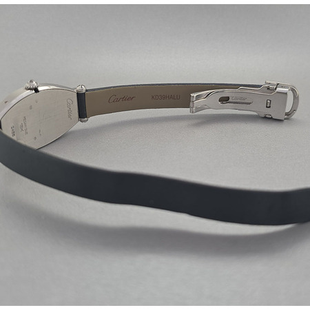 Introducing the exquisite **Cartier Tonneau 21x40mm WA502551**, a perfect blend of luxury and sophistication tailored for discerning women. Crafted from **18K white gold**, this stunning timepiece redefines elegance with its sleek design and remarkable features. The **case size** of **21x40 mm** offers a bold yet graceful presence on the wrist while ensuring comfort for everyday wear. The striking **silver face** is adorned with classic **Roman numerals**, making it not just a functional accessory but also an eye-catching statement piece. This luxurious women's watch is equipped with a reliable **manual movement**, offering precision that every horology enthusiast appreciates. The **deployment clasp** ensures ease of use while providing security when worn. Complementing its sophisticated look is the soft and stylish **gray satin band**, designed to blend seamlessly into any wardrobe—be it casual or formal. With water resistance capabilities, this Cartier timepiece promises durability along with elegance. Please note that this exquisite piece comes without original box or papers but remains an invaluable addition to any luxury collection. Elevate your style today with the timeless allure of the *Cartier Tonneau WA502551*.