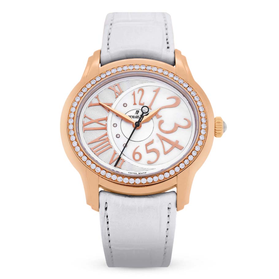 : Introducing the stunning Audemars Piguet Millenary 39.5mm women's watch (Reference: 77301OR.ZZ.D015CR.01), a true embodiment of luxury and elegance for discerning collectors and enthusiasts alike. Crafted with meticulous attention to detail, this timepiece features a beautiful mother of pearl face that exudes sophistication. The watch is housed in a striking case made from premium 18K rose gold, measuring a generous 39.5 mm in diameter—ideal for making a statement on your wrist. The fixed bezel complements the case beautifully while maintaining the classic aesthetic that Audemars Piguet is renowned for. Designed specifically for women who appreciate both style and functionality, this luxury timepiece showcases Arabic numerals that enhance readability at a glance. It is powered by an advanced automatic movement ensuring precision in every tick. Comfort meets sophistication with the full white leather strap that wraps around your wrist securely using a deployment clasp for ease of wear. Although it does not come with a box or papers, its elegance speaks volumes about its craftsmanship. With water resistance capabilities, you can enjoy peace of mind while wearing this exquisite piece on various occasions—be it casual outings or formal events. Elevate your collection with the Audemars Piguet Millenary women’s watch—a perfect blend of artistry and engineering designed for those who cherish timeless elegance.