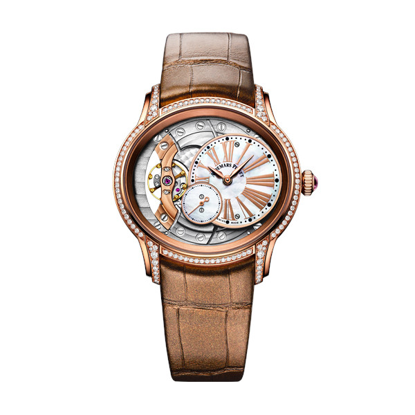 Introducing the **Audemars Piguet Piguet Millenary**, a stunning unisex watch that seamlessly combines luxury and functionality. With a case size of **39.5 mm** and reference number **77247OR.ZZ.A812CR.01**, this timepiece is crafted from **18K rose gold**, exuding elegance and sophistication. The breathtaking **mother of pearl face** adds a unique touch to the overall design while Roman numeral indices provide clarity and style at a glance. This luxury timepiece features a fixed bezel made from matching **18K rose gold**, enhancing its refined appearance. Designed for versatility, this unisex watch comes with a full brown leather strap that not only ensures comfort but also complements the rich tones of the gold casing perfectly. The tang clasp type provides secure closure for everyday wear. With a water resistance rating of up to **20 meters / 60 feet**, you can confidently wear it on various occasions without worry. The manual movement ensures precision in every tick while showcasing Audemars Piguet's commitment to craftsmanship. Although it does not come with a box, this stunning piece includes papers verifying its authenticity—making it an ideal choice for collectors or anyone looking to invest in a timeless accessory. Elevate your collection with the Audemars Piguet Piguet Millenary—a true statement piece that embodies luxury and style in every detail!