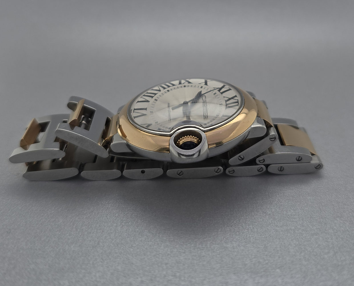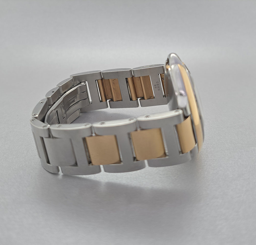 : Introducing the exquisite **Cartier Ballon Bleu 36mm** W2BB0003 unisex watch—a perfect blend of luxury and sophistication. Crafted by the renowned brand **Cartier**, this timepiece showcases a stunning case size of **36 mm** made from premium **18K rose gold** combined with resilient **stainless steel**. The elegant silver face features classic **Roman numeral indices**, adding a touch of timelessness to its design. With an **automatic movement**, this watch not only enhances your look but also ensures precision in keeping time. For added convenience and comfort, the wrist size fits most with its full band crafted from both **18K rose gold** and stainless steel. The double fold clasp type guarantees security while wearing it throughout your day. Designed for style as well as practicality, the Cartier Ballon Bleu is water-resistant up to **30 meters (100 feet)**—ideal for everyday wear without compromising on elegance. Although it does not come with a box, it includes papers verifying its authenticity. Originally produced in **2018**, this luxury timepiece is designed for anyone who appreciates high-quality craftsmanship. Elevate your accessory collection with this stunning unisex watch that embodies sophistication and charm!