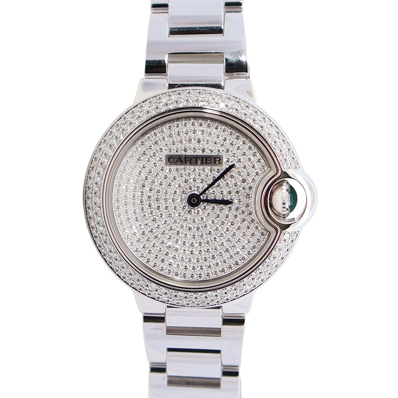 Introducing the exquisite **Cartier Ballon Bleu** 33mm women's watch (Reference: **WE902048**), a timeless piece that embodies elegance and sophistication. Crafted from luxurious **18K white gold**, this stunning wristwatch features a pristine **white face** that complements its refined design. With a case size of **33 mm**, the Ballon Bleu is designed to fit comfortably on any wrist size thanks to its full band made of shimmering **silver**. The non-numeric hour marks provide an understated yet classy touch to its overall aesthetic. This model boasts a **fold-over push-button clasp**, ensuring both security and ease of wear. Produced in **2021**, this automatic movement timepiece reflects Cartier's commitment to quality and craftsmanship. The fixed bezel also enhances its sleek profile while providing water resistance for added durability. Although it does not come with its original box, it includes essential papers confirming its authenticity. Whether you're looking for a statement piece or an everyday luxury accessory, the Cartier Ballon Bleu is sure to elevate your style and make you stand out. Experience the perfect blend of functionality and fashion with this remarkable **Cartier women's watch** – an ideal choice for those who appreciate luxury and precision in their accessories.