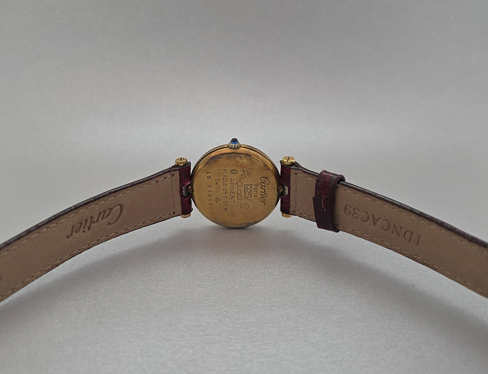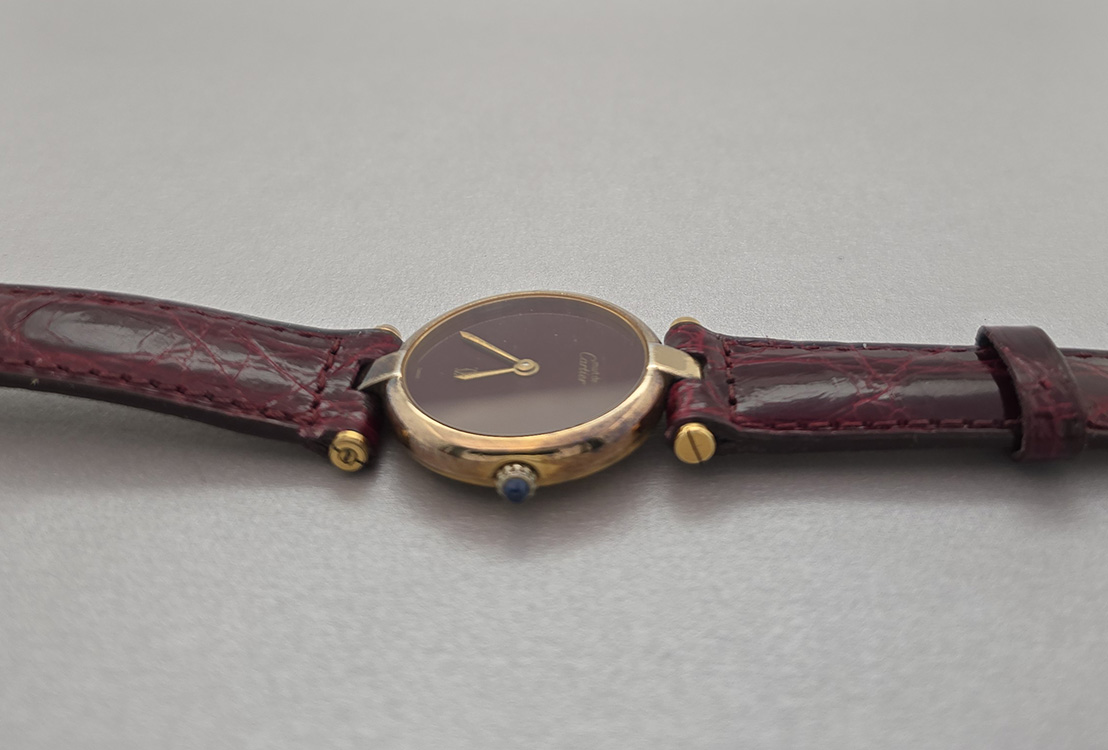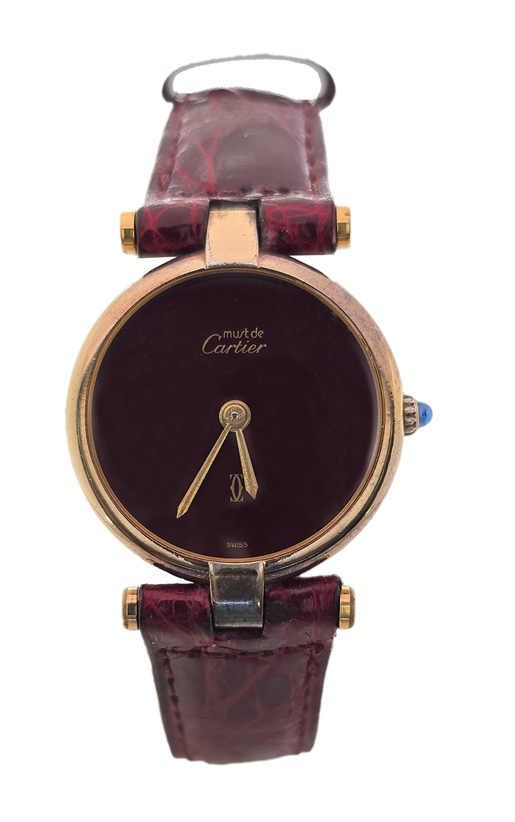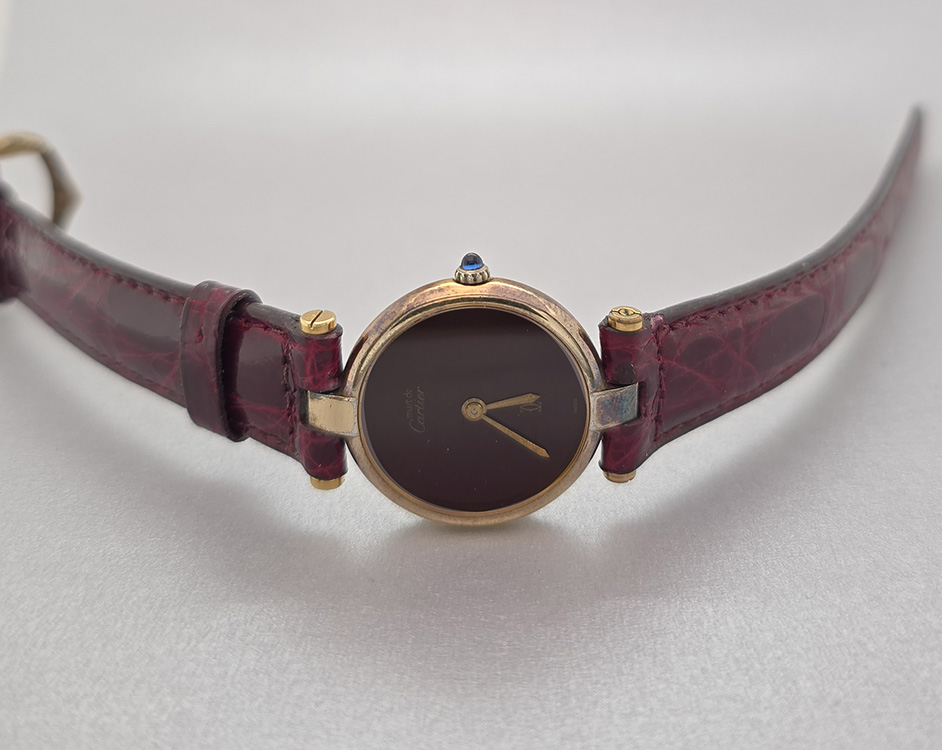 Elevate your accessory collection with the exquisite **Cartier Must Vendome 24mm Silver Women's Watch**. This luxurious timepiece showcases a striking **burgundy face**, perfectly complemented by a sleek **silver case** crafted from high-quality materials. Designed for women who appreciate both style and functionality, this watch features a compact **case size of 24 mm**, making it an ideal fit for any wrist. The **leather strap** adds a touch of sophistication while ensuring comfort during all-day wear. With its unique **non-numeric hour marks**, you can effortlessly tell time while making a fashion statement. The **fixed bezel**, also made of silver, enhances the overall aesthetic without compromising durability. Powered by reliable **quartz movement**, this Cartier piece guarantees precision in every tick. Plus, its water-resistant feature makes it suitable for daily use without sacrificing elegance. The absence of a box is offset by included paperwork that authenticates your purchase as part of the renowned Cartier brand. Whether you're dressing up for an occasion or adding flair to your everyday outfit, the Cartier Must Vendome is the perfect accessory to complete your look. Make this remarkable women's watch yours today and experience the blend of luxury and practicality that only Cartier can deliver!