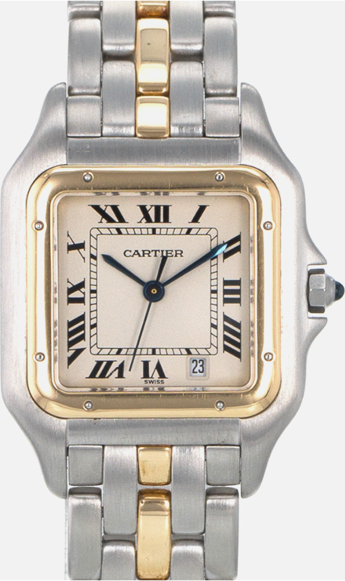 Elevate your style with the exquisite **Cartier Panthere Women's Watch**, model number **839490**. This stunning timepiece boasts a refined case size of **27mm x 36mm**, expertly crafted from **18K white gold** and **stainless steel**, making it an ideal accessory for any sophisticated wardrobe. The face color is a pristine **white**, enhancing visibility while exuding timeless elegance. Designed specifically for women with a wrist size of up to **7 inches**, this luxury watch combines functionality with fashion seamlessly. Featuring elegant **Roman numerals** as indices and protected by durable materials, the watch showcases precision through its reliable **quartz movement**. The strap is made of high-quality **18K yellow gold** and stainless steel, providing both comfort and durability. The convenient **fold clasp hidden** ensures that you can wear this piece confidently throughout your day. Please note that this item does not come with original box or papers but still retains all the charm associated with the prestigious brand *Cartier*. Whether you're dressing up for a special occasion or adding sophistication to your everyday look, the Cartier Panthere Women's Watch is sure to turn heads and spark conversations. Indulge yourself in luxury—this beautiful timepiece awaits!
