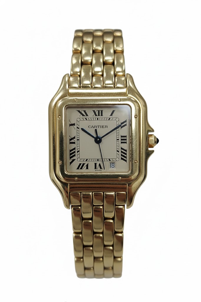 Discover the elegance of the **Cartier Panthere** 26.5mm unisex watch, a stunning blend of sophistication and luxury that is perfect for any occasion. This exquisite timepiece features a beautifully crafted **18K yellow gold** case and strap, providing both durability and a touch of opulence. The **white face** of the watch showcases classic **Roman numeral indices**, adding to its timeless charm and making it easy to read at a glance. The **fixed bezel**, also made from **18K yellow gold**, adds an element of refinement to its overall design. Designed with versatility in mind, this unisex luxury watch is suitable for all wrist sizes thanks to its full band length. It is powered by reliable **quartz movement**, ensuring accurate timekeeping wherever you go. With water resistance capabilities and a secure **double fold clasp**, the Cartier Panthere is not only stylish but also practical for everyday wear. Although it does not come with original box or papers, this piece remains an exceptional addition to any collection or perfect as a thoughtful gift. Embrace the allure of high-end horology with the Cartier Panthere - where style meets functionality in one elegant package.
