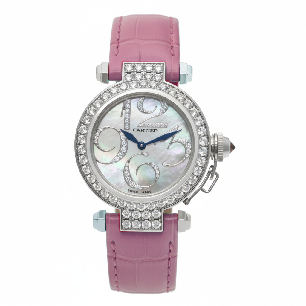 Experience the epitome of luxury with the **Cartier Pasha 32mm Women's Watch (Reference: WJ123221)**. This exquisite timepiece is designed for women who appreciate fine craftsmanship and sophisticated style. Crafted from **18K white gold**, this watch exudes elegance and charm. The **32 mm case size** is perfectly proportioned for a feminine touch while ensuring durability and strength. The striking **mother of pearl face** adds a unique depth to the watch's design, complemented by bold **Arabic numerals** that make telling time effortless. The watch features a comfortable **pink leather strap**, designed for full wrist sizes. Its secure **deployment clasp** ensures that it stays in place while you go about your day. With its **automatic movement**, you can rely on precise timing without the need for batteries. Water-resistant and ready for any occasion, this Cartier Pasha watch not only serves as a functional accessory but also as a statement piece that showcases your personal style. Note that this watch does not come with original box or papers. Elevate your collection with the timeless sophistication of the Cartier Pasha Women's Watch – where classic design meets modern luxury!