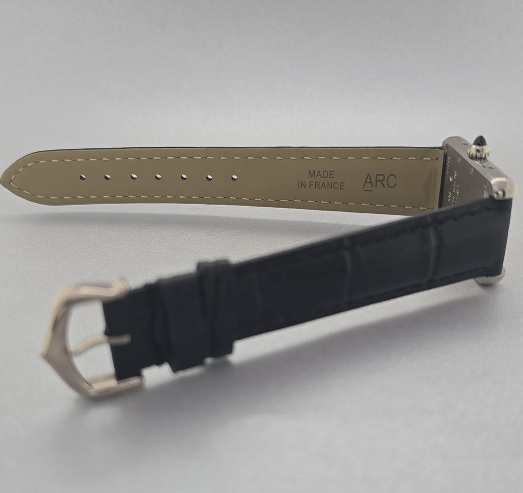 Introducing the **Cartier Tank Louis**, a luxurious women's watch that embodies elegance and sophistication. This exquisite timepiece features a refined **22x29 mm** case made of **18K white gold**, making it not only a statement accessory but also a testament to fine craftsmanship. The model number **W1541056** ensures authenticity and recognition among connoisseurs. The watch boasts a beautiful **white face** adorned with classic **Roman numeral indices**, which add to its timeless appeal. It is designed with a **fixed bezel** made of the same high-quality 18K white gold that encases the delicate quartz movement within. Comfort meets style with the full-length **black leather strap**, which integrates seamlessly with the overall aesthetic of the watch. While this model does not come with its original box or papers, it remains an exceptional example of luxury wristwear. With water resistance capabilities and a secure **tang clasp type**, this Cartier Tank Louis is suitable for everyday wear or special occasions alike. Elevate your accessory collection with this remarkable timepiece that perfectly combines functionality and fashion.