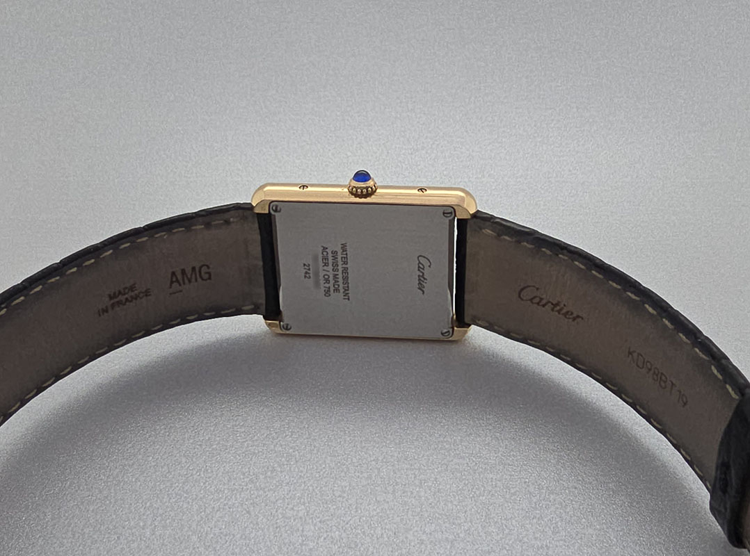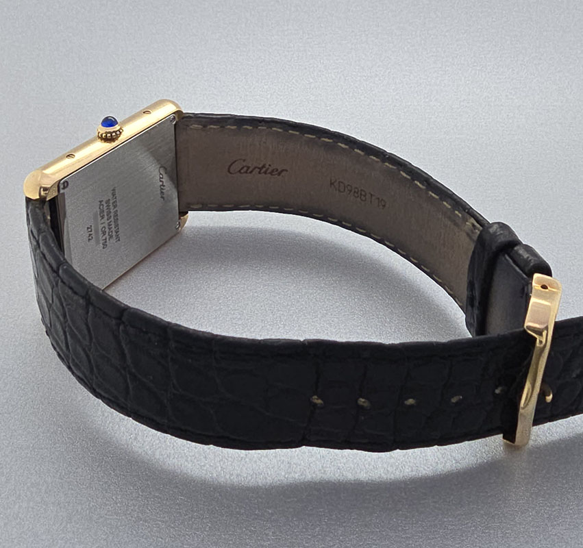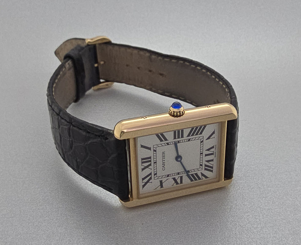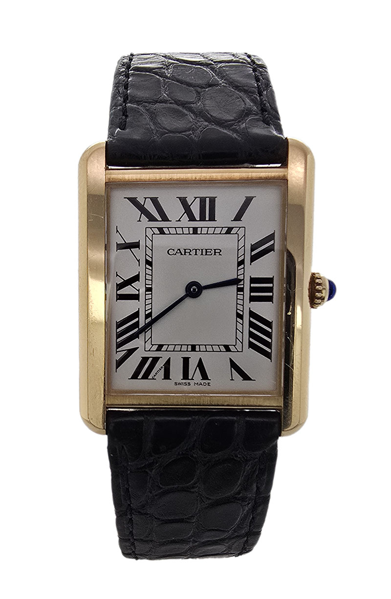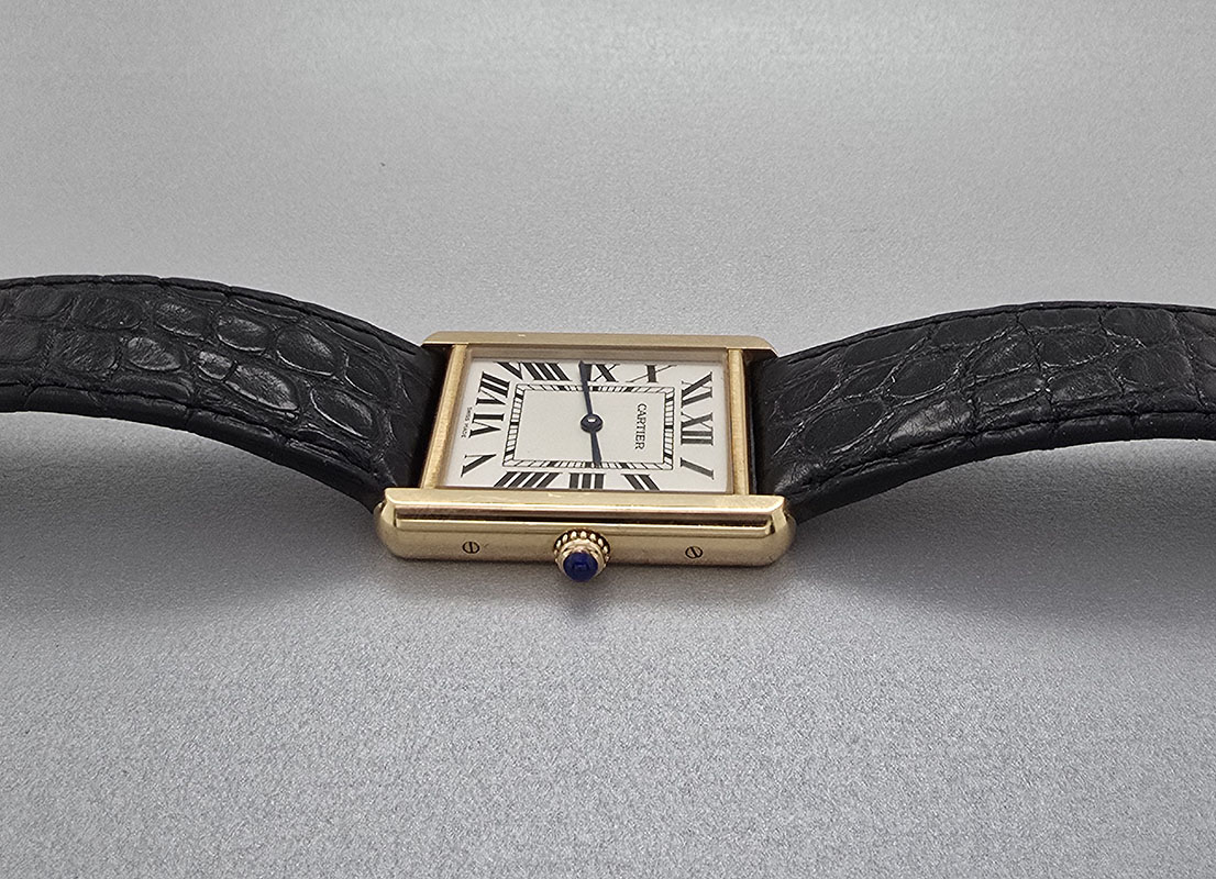 Elevate your accessory collection with the exquisite **Cartier Tank Solo Women's Watch**, model **W1018855**. This stunning timepiece features a refined **case size of 35 x 27 mm**, crafted from lustrous **18K yellow gold** that radiates sophistication. The elegant **silver face** is adorned with classic **Roman numeral indices**, enhancing its timeless appeal. Designed for both style and comfort, this luxury watch comes with a durable yet chic **black leather strap**, secured by a reliable **tang clasp** for easy wear. With a water resistance of up to **30 meters (100 feet)** and powered by precise **quartz movement**, this timepiece is as functional as it is fashionable. Whether you're dressing up for an event or adding a touch of elegance to your everyday attire, the Cartier Tank Solo is the perfect choice for women who appreciate fine craftsmanship and luxurious design. Note that this product does not come with original box or papers but maintains its status as an iconic piece in haute horology. Experience the unparalleled charm of the Cartier brand today!