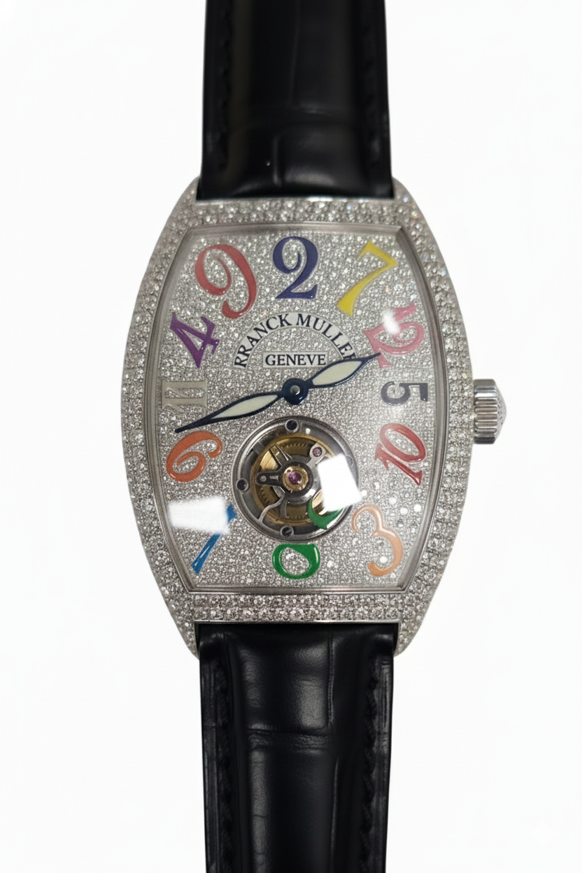 Introducing the **Franck Muller Crazy Hours Color Dreams Tourbillon**, a stunning luxury timepiece that redefines elegance and sophistication. Crafted with precision and attention to detail, this remarkable men's watch boasts a unique **case size of 39 x 53 mm** and is adorned with an exquisite **18K white gold** case and bezel. The reference number for this iconic piece is **8880 T CH D CD COL DRWG**, ensuring its authenticity as part of the renowned Franck Muller collection. The striking **white dial features Arabic numerals**, providing both style and readability at a glance. Paired with a sleek **black leather strap**, this timepiece combines comfort with high-end fashion. Powered by an exceptional **automatic movement**, the Franck Muller Crazy Hours showcases not just artistry but also top-tier functionality. While it boasts impressive water resistance capabilities, it remains perfect for any occasion—be it formal or casual. Although it comes without original box or papers, its retail value of **$259,600** speaks volumes about its craftsmanship and exclusivity. Elevate your wrist game with this limited edition masterpiece that captures the essence of luxury in every tick. Whether you're adding to your collection or searching for the ultimate gift for someone special, the Franck Muller Crazy Hours Color Dreams Tourbillon is sure to leave a lasting impression. Don’t miss out on owning this extraordinary blend of art and precision!