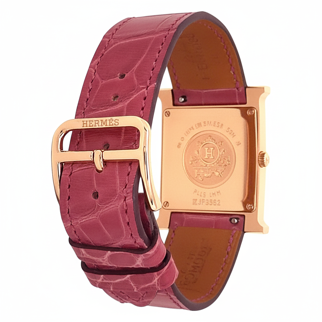 Introducing the exquisite **Hermes Heure H** women’s watch – a perfect blend of elegance and sophistication. Crafted with meticulous attention to detail, this timepiece features a unique **case size of 30 x 35 mm**, making it an ideal accessory for any wrist. The luxurious **18K rose gold** case and bezel exude opulence while providing durability and style. The enchanting **mother of pearl face** adds an ethereal quality to the timepiece, complemented by stylish **Arabic numerals** that ensure easy readability. Powered by a reliable **automatic movement**, this watch promises accuracy and longevity. Designed with comfort in mind, the full band is made from premium pink leather that not only enhances its aesthetic appeal but also ensures a comfortable fit on your wrist. Although it does not come with box or papers, its authenticity remains unquestionable as you wear this stunning piece. With water resistance capabilities and a secure tang clasp type to keep it securely fastened on your wrist, the Hermes Heure H is as practical as it is beautiful. Whether dressing up for an elegant evening or adding flair to your everyday outfit, this luxury women’s watch from Hermes is the ultimate statement piece that reflects your exceptional taste. Elevate your collection today with the **Hermes Heure H 30x35mm (HH1.571e)** – where timeless design meets modern functionality!