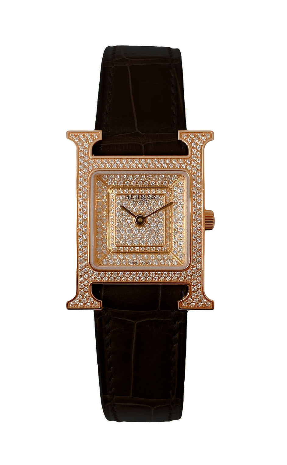 Introducing the elegant **Hermes Heure 21.5x30mm HH4.273** women's watch—an exquisite blend of sophistication and luxury that embodies the essence of the renowned brand Hermes. This remarkable timepiece features a **case size** of **21.5x30 mm**, crafted from sumptuous **18K rose gold**, ensuring both durability and a radiant shine that catches the eye. The **face color** of this luxurious wristwatch is a classic white that provides a perfect backdrop for its minimalist design—free from hour marks for an ultra-clean look that adds to its modern appeal. The **fixed bezel**, also made from **18K rose gold**, complements the overall aesthetic beautifully. Designed for comfort and style, this exquisite timepiece comes with a sleek **black leather strap** that fits comfortably around your wrist. The tang clasp type ensures secure wear while adding an element of ease when putting on or taking off your favorite accessory. Equipped with reliable **quartz movement**, this Hermès watch guarantees precision timing while offering water resistance for added functionality in daily life or special occasions. This luxury women's wristwatch does not come with a box or papers but stands as an authentic symbol of elegance and high fashion in any collection. Whether you're dressing up for an event or looking to elevate your everyday style, the Hermes Heure HH4.273 is sure to make a statement wherever you go. Embrace timeless beauty with the Hermès Heure women’s watch—a true masterpiece designed for those who appreciate quality craftsmanship and sophisticated style in every moment they wear it!