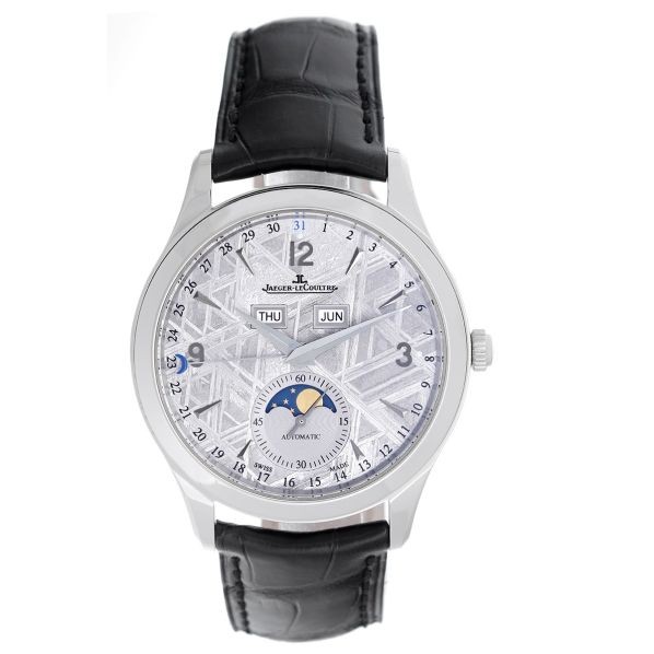 Introducing the Jaeger-LeCoultre Master Calendar 39mm (Reference: 176.8.12.S), an exquisite timepiece that embodies luxury and precision in every detail. Crafted from high-quality stainless steel, this men's watch is designed for those who appreciate fine craftsmanship and sophisticated style. The standout feature of this remarkable watch is its unique meteorite face that adds an extraordinary touch to its aesthetic appeal. The non-numeric hour marks enhance readability while maintaining a clean and elegant design that is perfect for any occasion. With a case size of 39 mm and water resistance up to 50 meters, this automatic movement wristwatch ensures both functionality and durability. It features a comfortable leather strap secured with a deployment clasp for easy wearability. Whether you're dressing up for a formal event or looking for an everyday luxury accessory, the Jaeger-LeCoultre Master Calendar is the ideal choice for discerning gentlemen who value quality and style in their watches. Please note that this model does not come with original box or papers but offers unmatched elegance at retail value of $0.00—truly making it a timeless investment piece for your collection!
