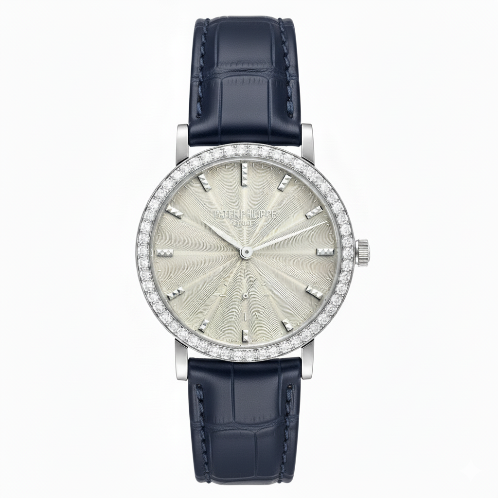 Introducing the exquisite **Patek Philippe Calatrava** women's watch (Model: **7120G-001**), a luxurious timepiece designed for those who appreciate sophistication and timeless beauty. With a case size of **31 mm**, this stunning watch is crafted from premium **18K white gold**, ensuring durability and a touch of elegance. The captivating **ivory face color** adds to its charm while maintaining an understated look that allows for versatility in any wardrobe. The absence of hour marks on the dial emphasizes its minimalist design—a hallmark feature of the Calatrava series. Encircling the dial is a dazzling **diamond bezel**, further enhancing its allure. Comfort is not compromised with this elegant piece; it comes with a soft yet sturdy **satin strap** that fits comfortably on your wrist. The reliable **tang clasp** secures it perfectly, making it suitable for everyday wear or special occasions. With a water resistance rating of up to **30 meters**, this timepiece combines style with functionality. Powered by precision **manual movement**, you can trust in its accuracy and craftsmanship. Whether you're gifting this remarkable watch or adding it to your own collection, the Patek Philippe Calatrava embodies luxury and elegance that every woman deserves. Note that this model does not come with box or papers but retains its retail value as an investment piece in haute horology. Elevate your accessory game today with this iconic timepiece!