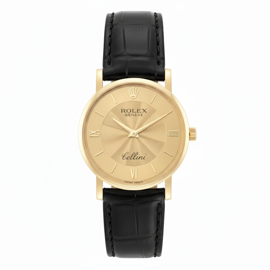 Introducing the stunning **Rolex Cellini 32mm** model **5115/8**, a masterpiece in luxury timepieces designed for both men and women. This exquisite **unisex watch** is meticulously crafted from **18K yellow gold**, showcasing a perfect blend of sophistication and style that stands out in any collection. With a case size of **32 mm**, this timepiece is ideal for those who appreciate understated elegance. The face features an eye-catching **ivory jubilee annive** dial adorned with classic **Roman numerals**, making it not only functional but also visually appealing. The luxurious look is further enhanced by its **fixed bezel**, also made of premium **18K yellow gold**. Designed for everyday wear and special occasions alike, this Rolex boasts a robust movement with manual winding capabilities. Its reliable performance is matched by its aesthetic appeal — housed within a case that offers water resistance up to **30 meters / 100 feet**, making it suitable for light splashes or rain. The wrist size accommodates various preferences thanks to its full band with an elegant black leather strap and a secure tang clasp type. Please note that this item does not come with original box or papers but remains an iconic piece from the production years of **2011 to Present**. Enhance your collection today with the timeless elegance of the Rolex Cellini 32mm 5115/8 — where luxury meets functionality in perfect harmony.