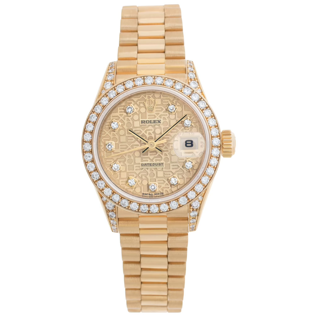 Introducing the stunning **Rolex DateJust 26mm** (Reference: **69158**), a luxurious women’s watch that epitomizes elegance and sophistication. Crafted from **18K yellow gold**, this exquisite timepiece is perfect for those who appreciate fine craftsmanship and timeless design. With a case size of **26 mm**, it is perfectly proportioned for a woman’s wrist. The striking **silver face** of the watch features non-numeric hour marks that enhance its classic appeal. The automatic movement ensures precision and reliability while you enjoy wearing this beautiful accessory. The sturdy fold-over push-button clasp allows for easy wearability while providing security on your wrist. Originally produced in **1995**, this Rolex DateJust has stood the test of time both in style and functionality. While it does not come with original papers or box, its authenticity as a genuine Rolex is unquestionable. The fixed bezel also crafted from **18K yellow gold** adds to its luxurious look while offering water resistance for added practicality. Whether you are dressing up for an occasion or looking to elevate your everyday style, the Rolex DateJust 26mm (Reference: **69158**) is not just a watch; it's an investment in timeless elegance that will last generations. Elevate your wrist game with this stunning piece today!