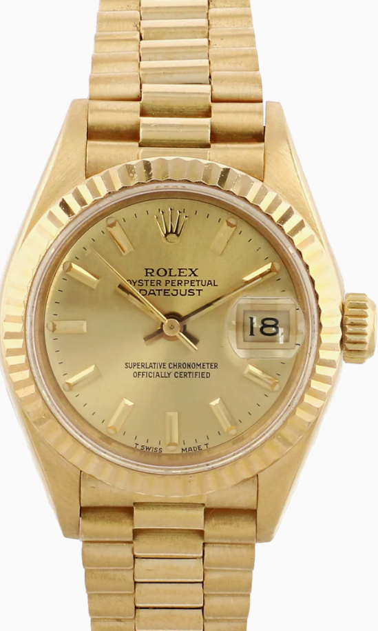 Experience unparalleled luxury with the **Rolex President Datejust**, a timepiece that embodies elegance and craftsmanship. Designed specifically for women, this stunning watch features a case size of **26 mm** and is meticulously crafted from **18K yellow gold**, ensuring both durability and opulence. The model number **69178** showcases its unique identity within the prestigious Rolex collection. The beautiful **champagne face** adds a touch of refinement to this masterpiece while the non-numeric hour marks enhance its classic aesthetic. With an automatic movement mechanism at its heart, this watch provides precision timing while offering ease of use. The strap/band is also fashioned from **18K yellow gold**, elegantly complementing the overall design. The fold clasp hidden feature not only secures it comfortably on your wrist but also maintains a seamless look. Additionally, this watch boasts water resistance, making it as practical as it is stylish. Please note that this timepiece does not come with original box or papers; however, its allure remains unchanged. Elevate your accessory game with this remarkable **Rolex President Datejust**—a quintessential choice for discerning women who appreciate luxury in every detail.