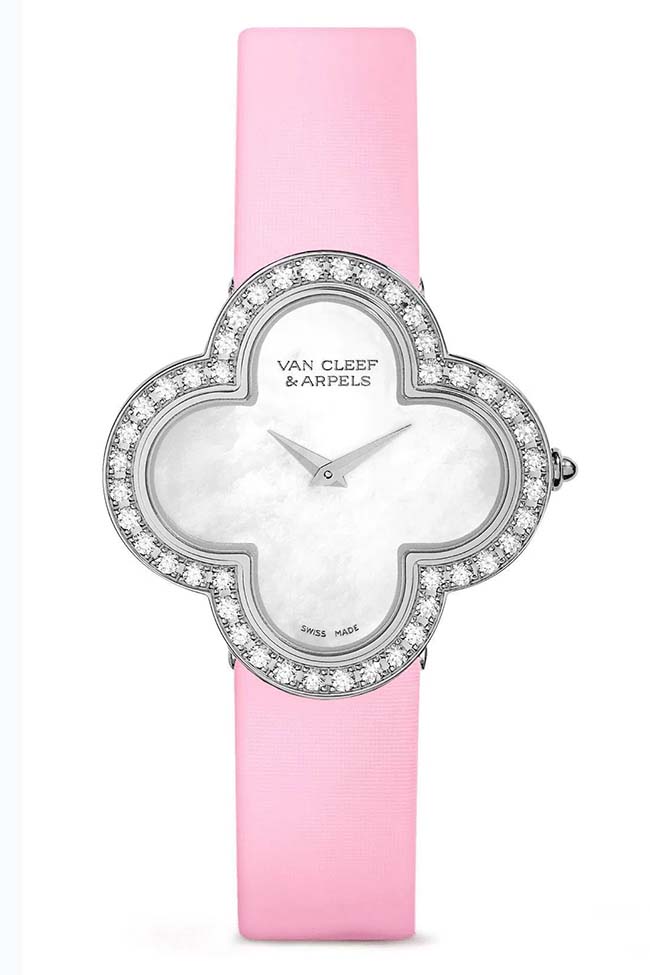 Introducing the enchanting **Van Cleef & Arpels Alhambra 30mm VCARF52700 Women's Watch**, a timepiece that beautifully combines luxury and elegance. This exquisite wristwatch is crafted with the finest materials, featuring an eye-catching **18K white gold case** that radiates sophistication. With a **case size of 30 mm**, this watch is perfect for women who appreciate classic design paired with modern functionality. The stunning **mother of pearl face** adds an iridescent touch to your wrist while ensuring easy readability through its non-numeric hour marks. This luxurious timepiece boasts a reliable **quartz movement**, ensuring precision in every tick. The **fixed bezel**, also made from **18K white gold**, complements the overall design while adding durability. Designed for comfort and style, it features a soft yet sturdy **pink Velcro strap** that adapts to different wrist sizes. While it’s water-resistant for everyday wear, please note that this model does not come with its original box or papers. The secure **tang clasp** ensures that this beautiful accessory remains safely on your wrist throughout your day. Elevate your jewelry collection with the Van Cleef & Arpels Alhambra Women's Watch—where timeless elegance meets contemporary charm!