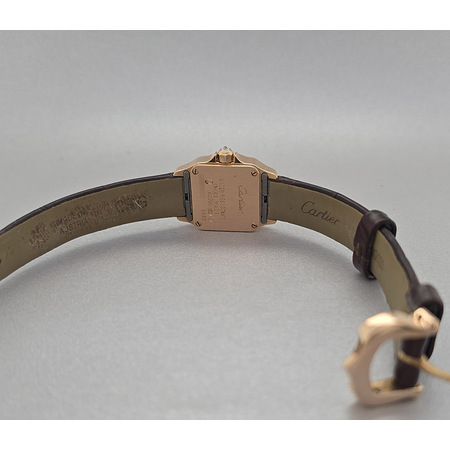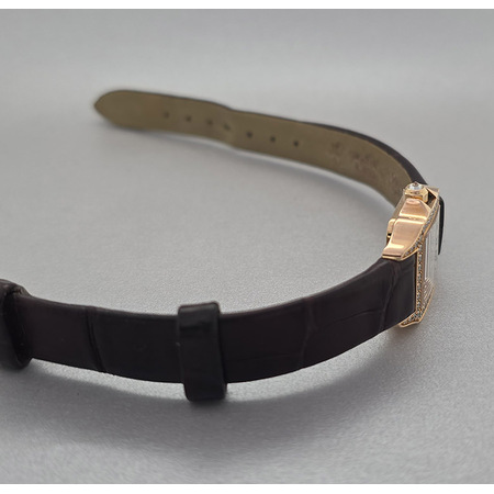 : Elevate your timepiece collection with the exquisite **Cartier Santos Demoiselle**. This elegant **women's watch**, reference number **WF902004**, boasts an eye-catching case size of **24mm x 19mm**, making it perfect for those who appreciate both style and functionality. Crafted from luxurious **18K rose gold**, this timepiece is adorned with a captivating diamond bezel that enhances its sophisticated charm. The striking **silver face** is complemented by classic Roman numeral indices, adding a timeless touch to its modern design. The **quartz movement** ensures precision in every tick while offering reliable performance day after day. With a water resistance of up to **30 meters**, this luxurious accessory can withstand everyday splashes without sacrificing its elegance. Designed for the discerning woman who values both fashion and function, this Cartier Santos Demoiselle features a comfortable leather strap and a secure tang clasp for ease of wear. Transform your wrist into a canvas of sophistication with the Cartier Santos Demoiselle—a true testament to luxury and style that speaks volumes about your refined taste in jewelry.